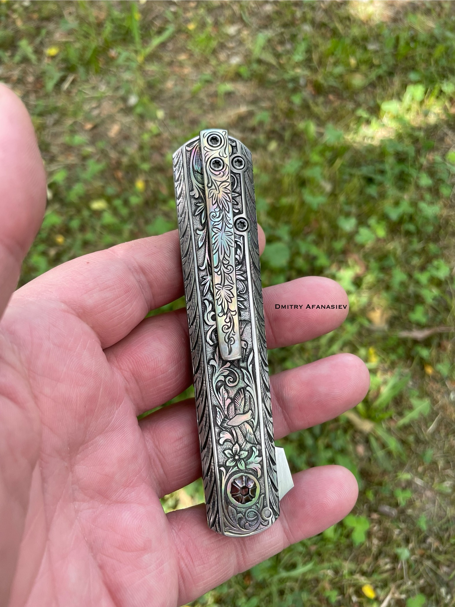 Рукоять сделана из титана, по рукояти с лицевой стороны идёт изящная обронная гравировка растительного орнамента