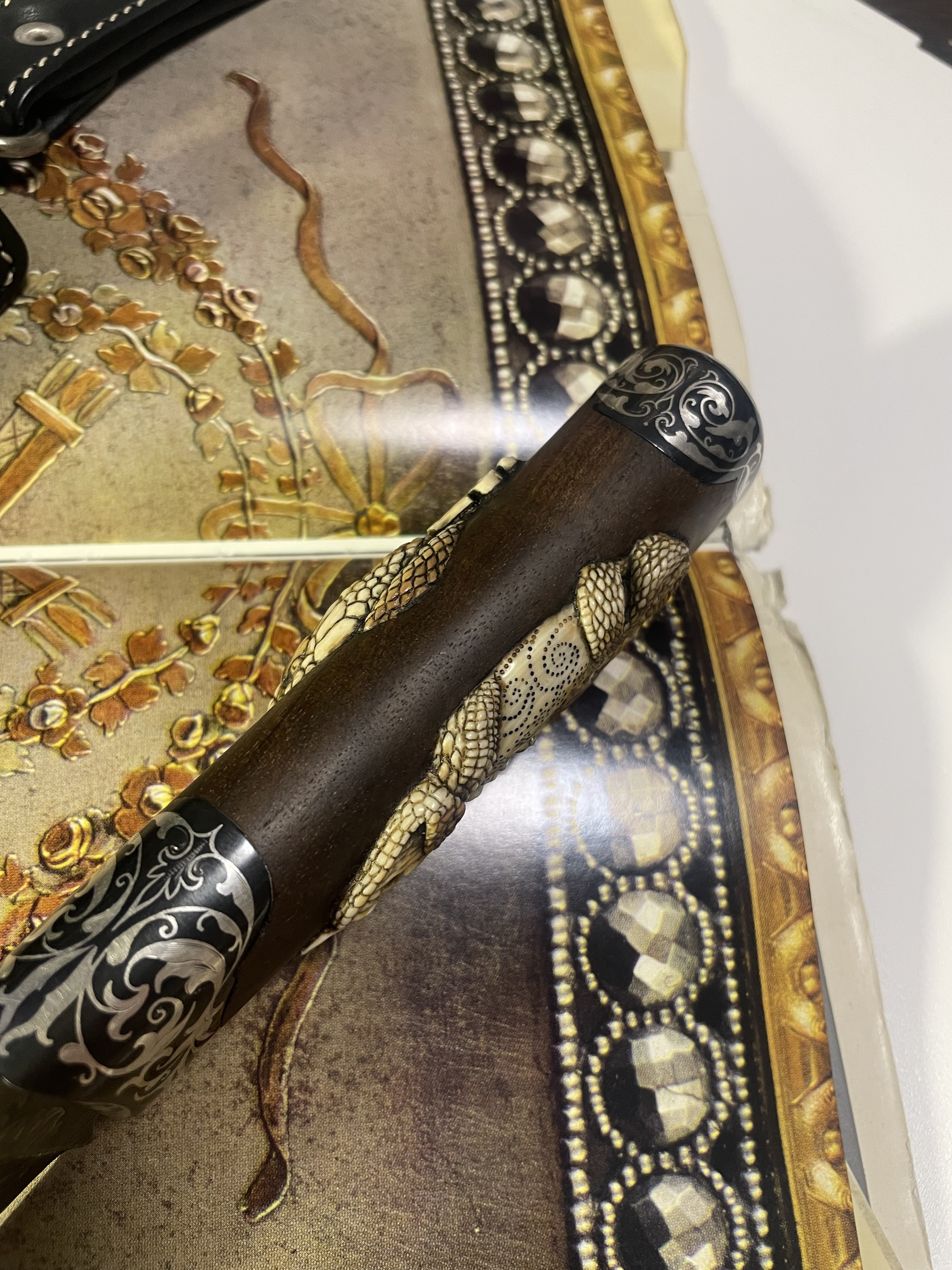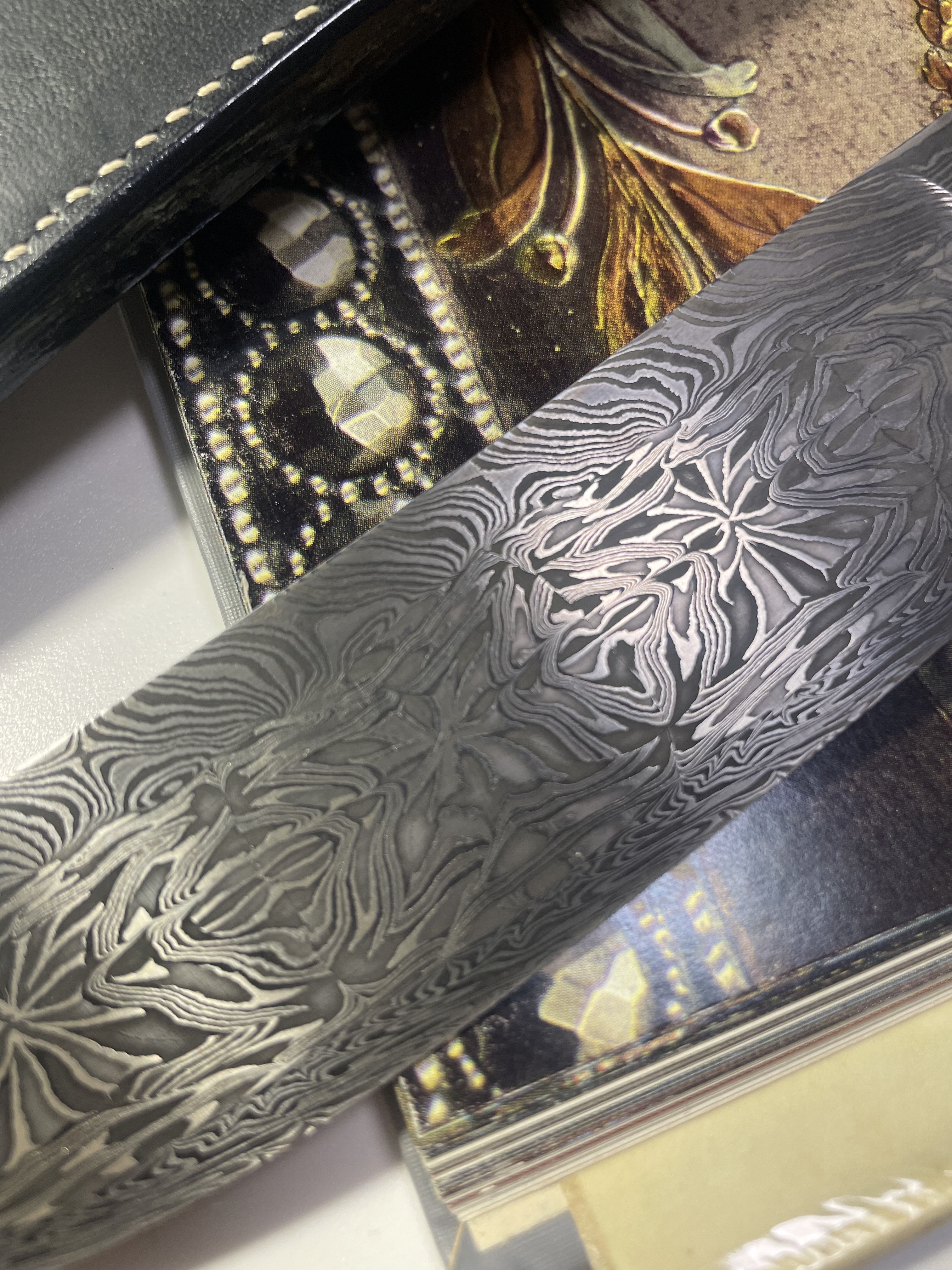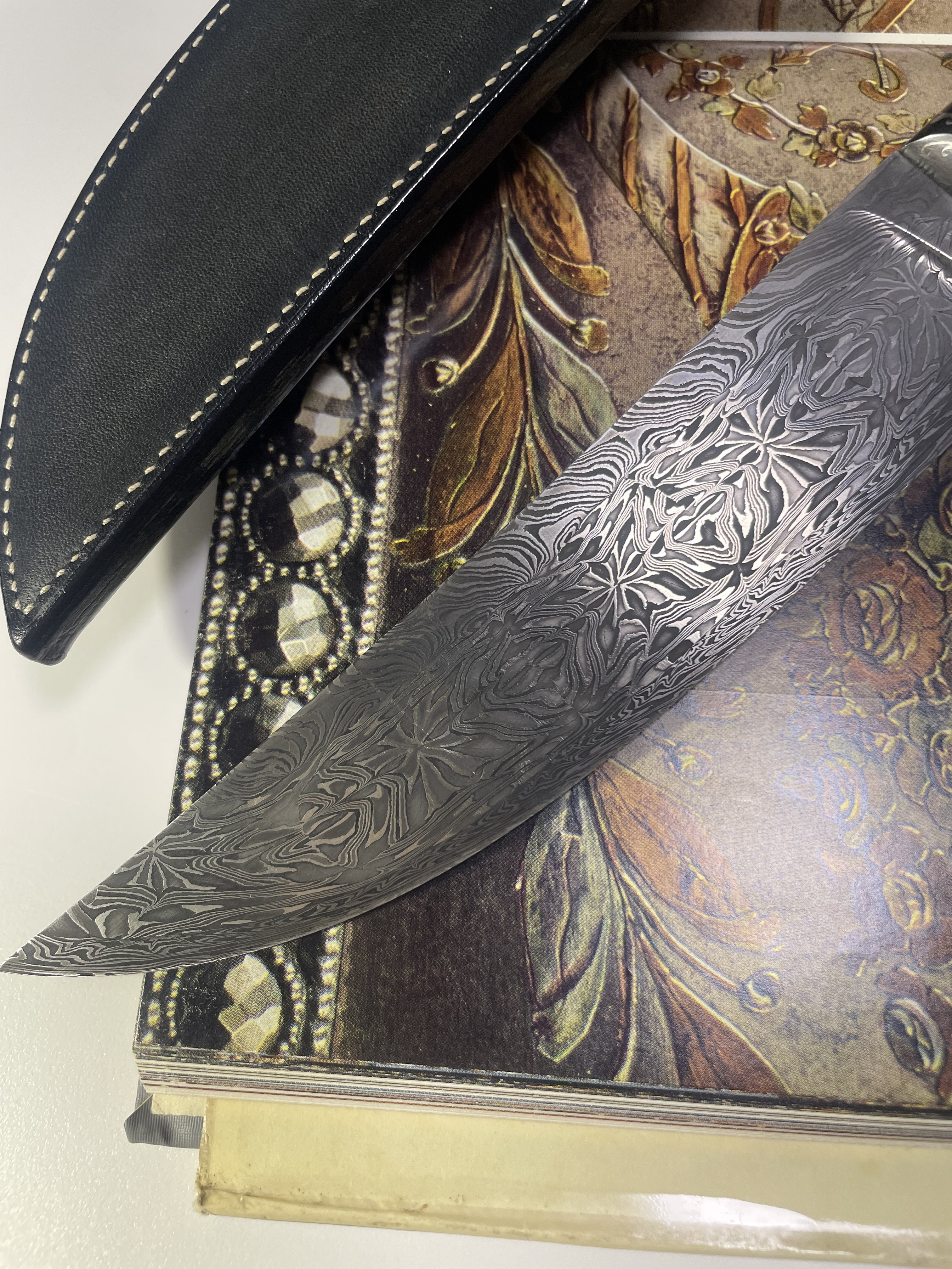 Клинок ковал кузнец Матвеев, мозаичный дамаск с добавлением никеля ,твёрдость 62 единицы.