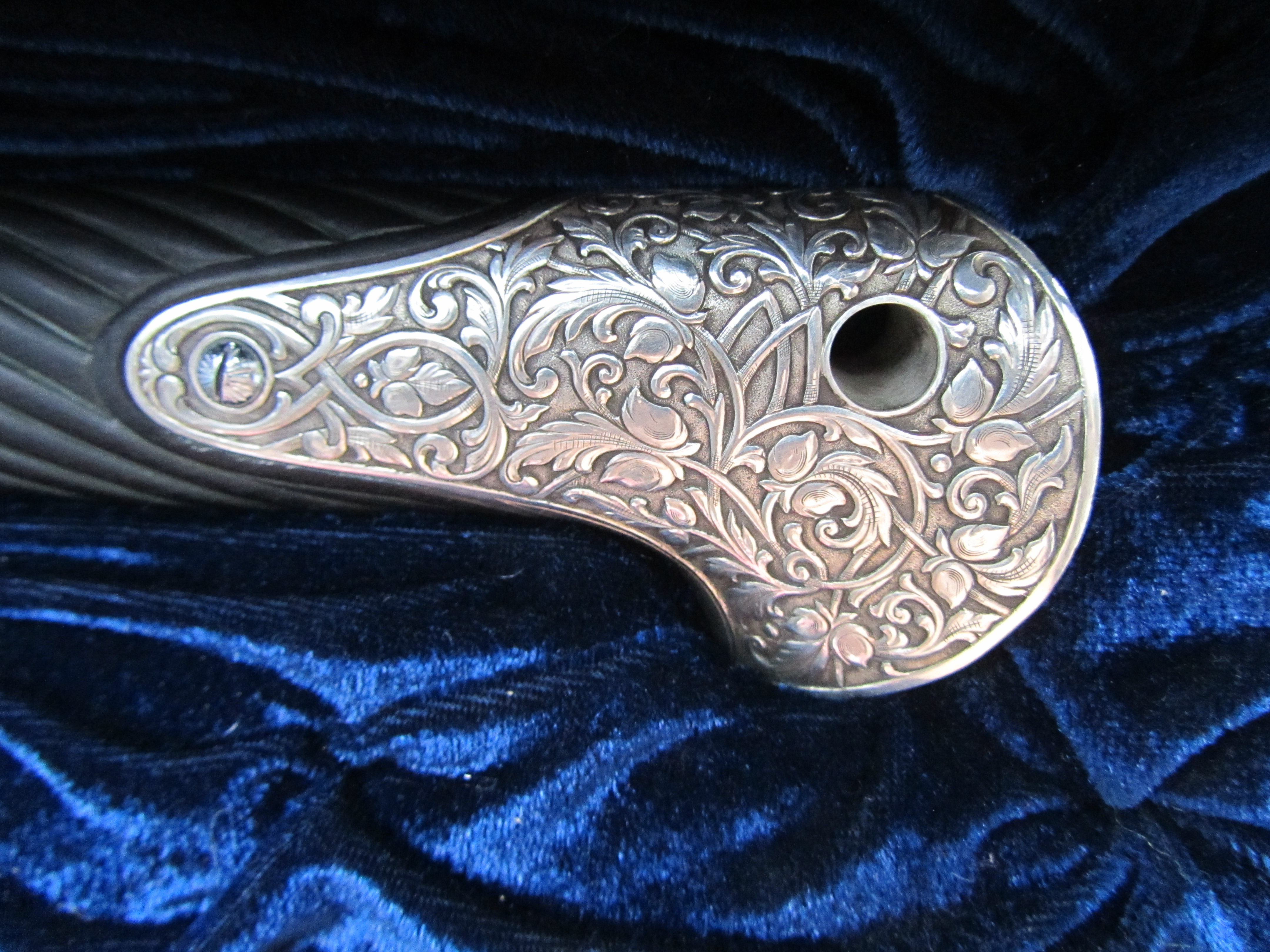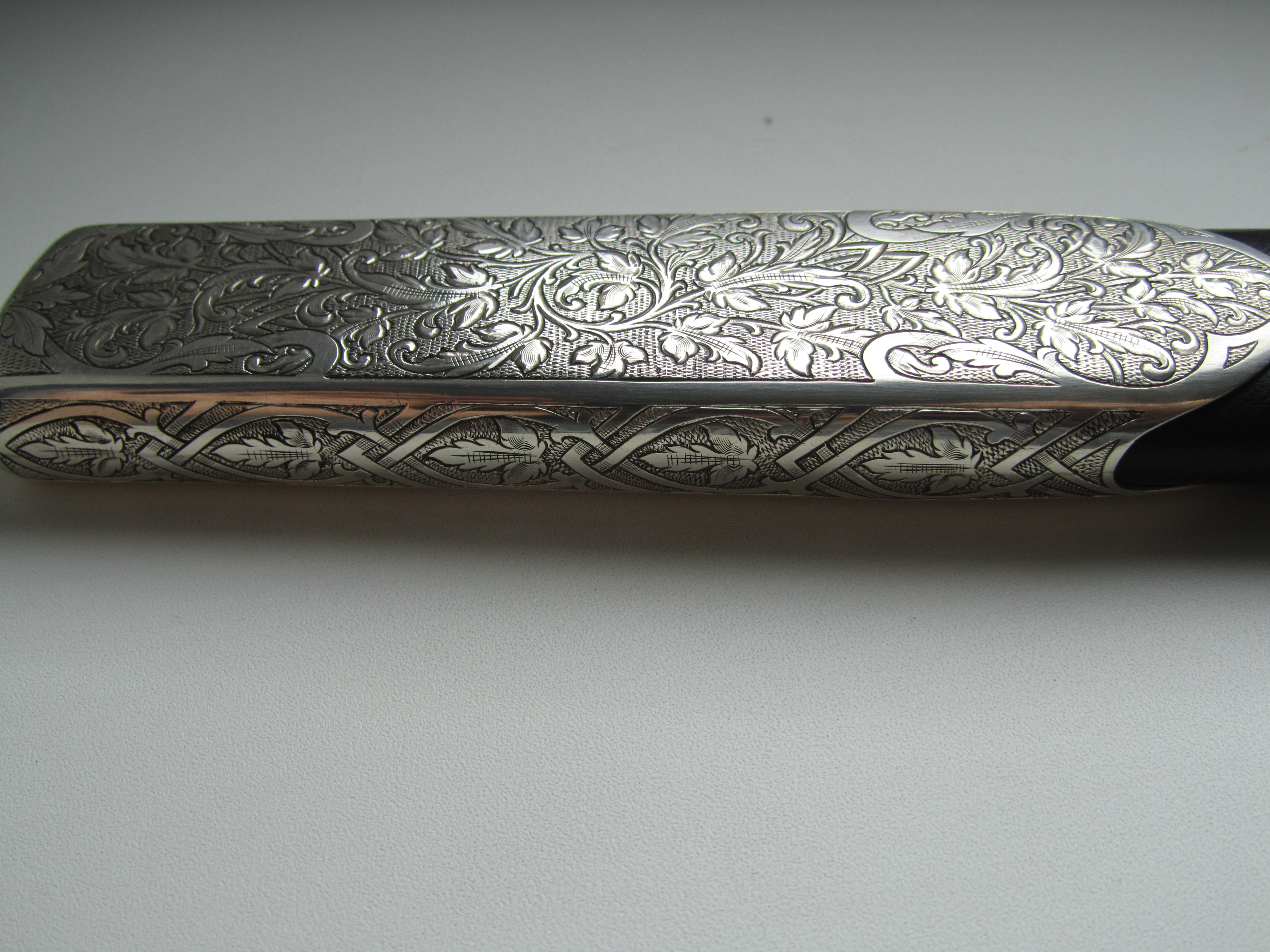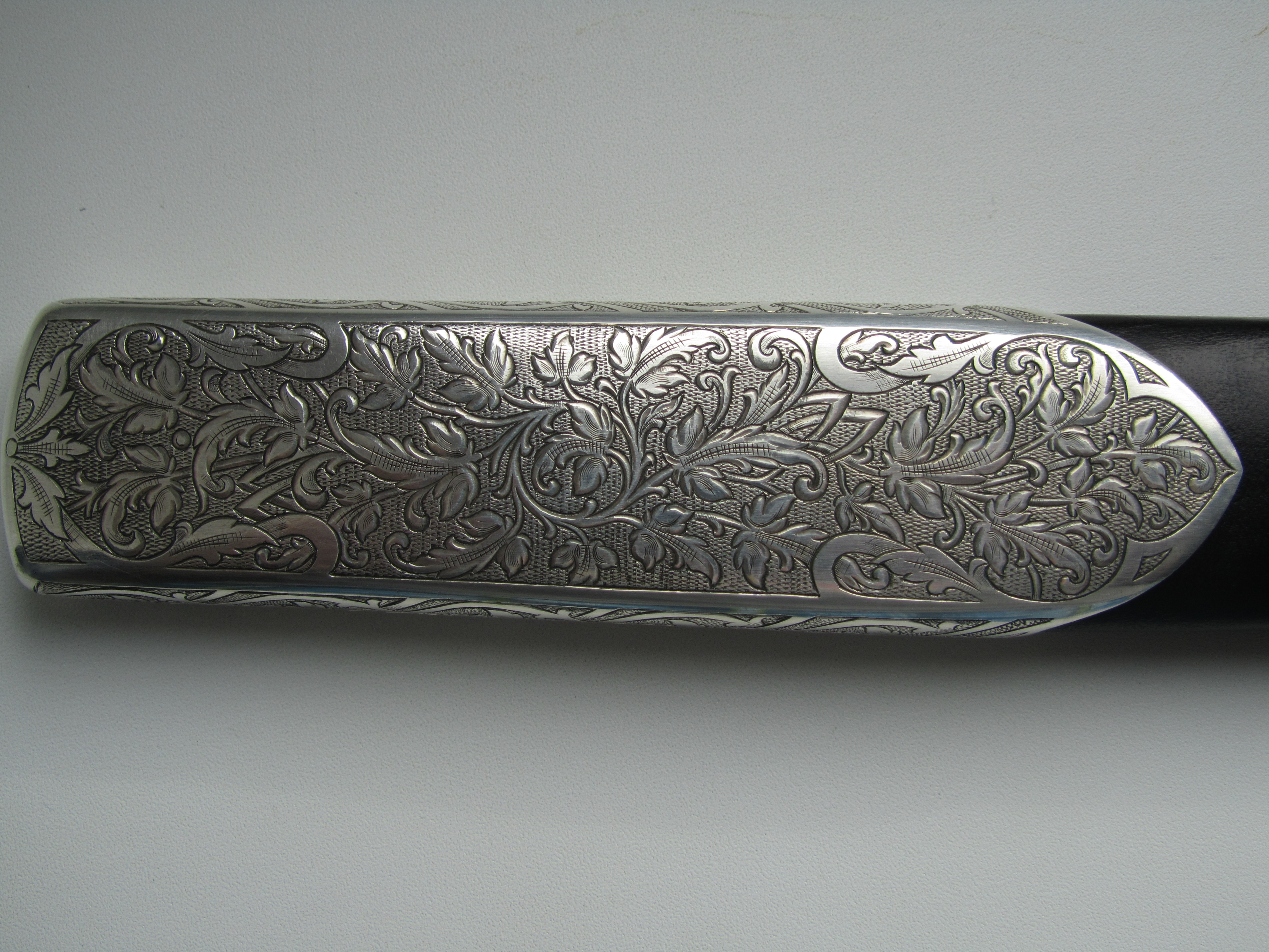Клинок из сверхпрочной дамасской стали великолепно гармонирует с рукоятью из черного дерева. Обратите внимание на отделку рукояти. Все декоративные элементы были изготовлены из чистейшего белого металла. На все элементы из благородного металла нанесен оригинальный орнамент «Парижский».
