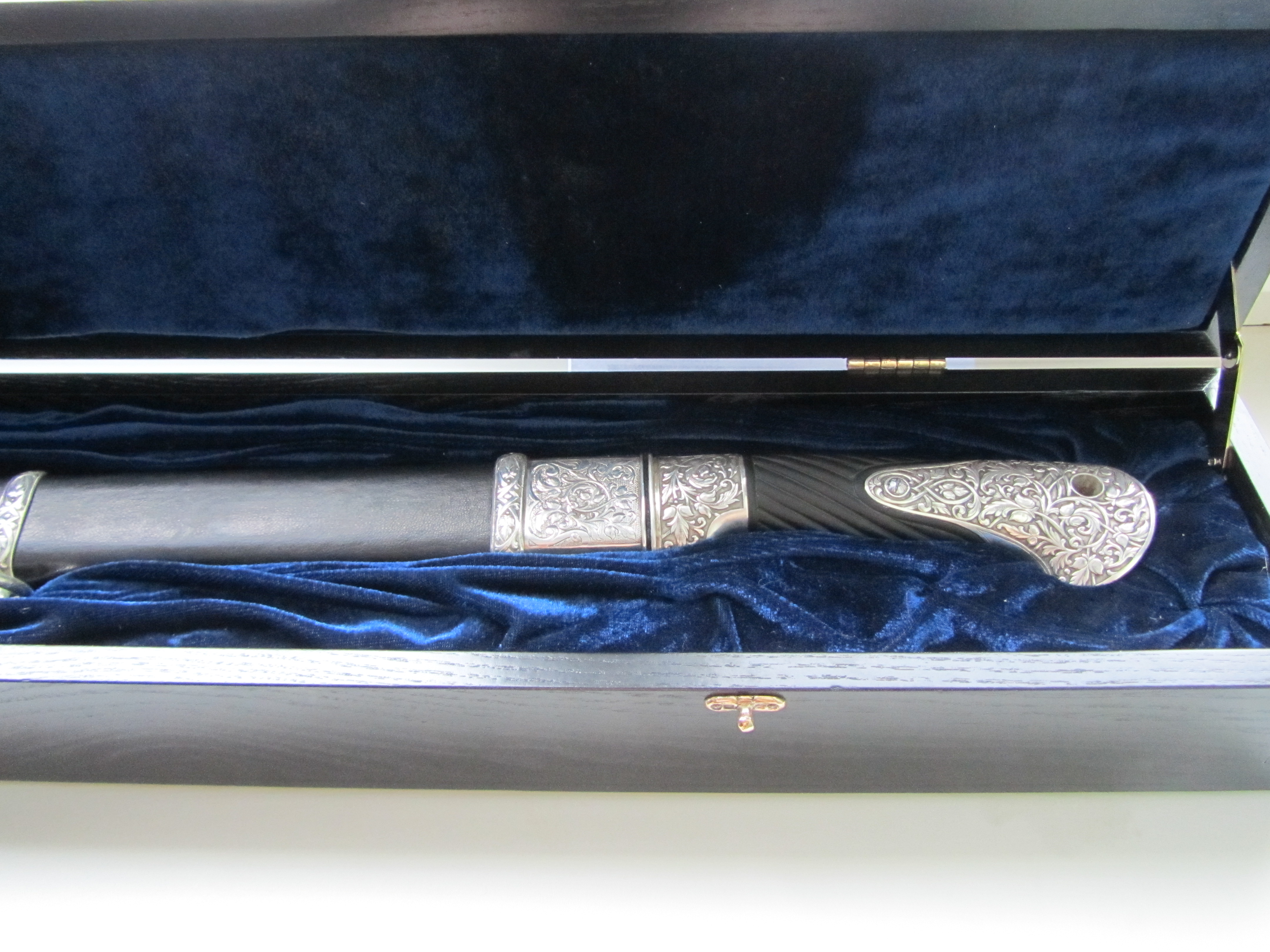 Шашка комплектуется ножнами, которые обтянуты натуральной кожей. Имеется также эксклюзивный дубовый футляр, отделанный внутри бархатом. Это прекрасный способ хранить данное оружие.
