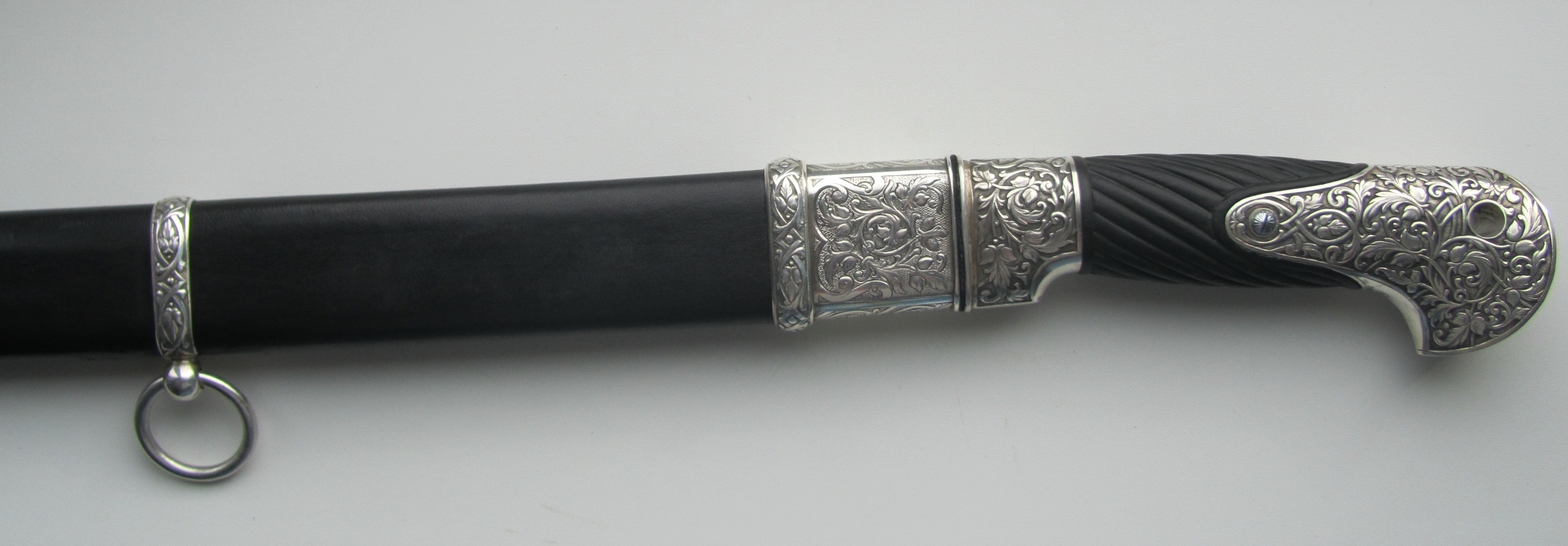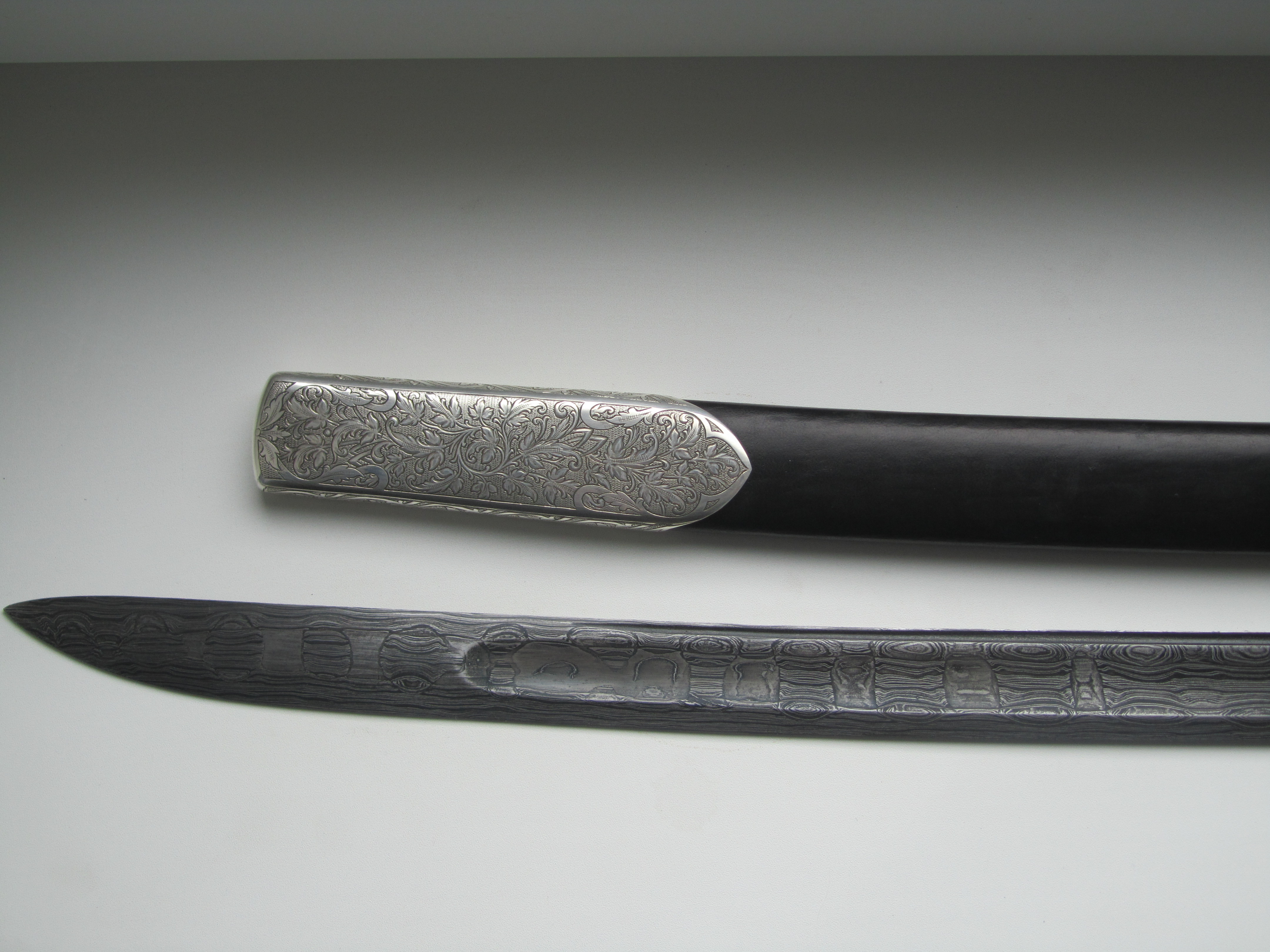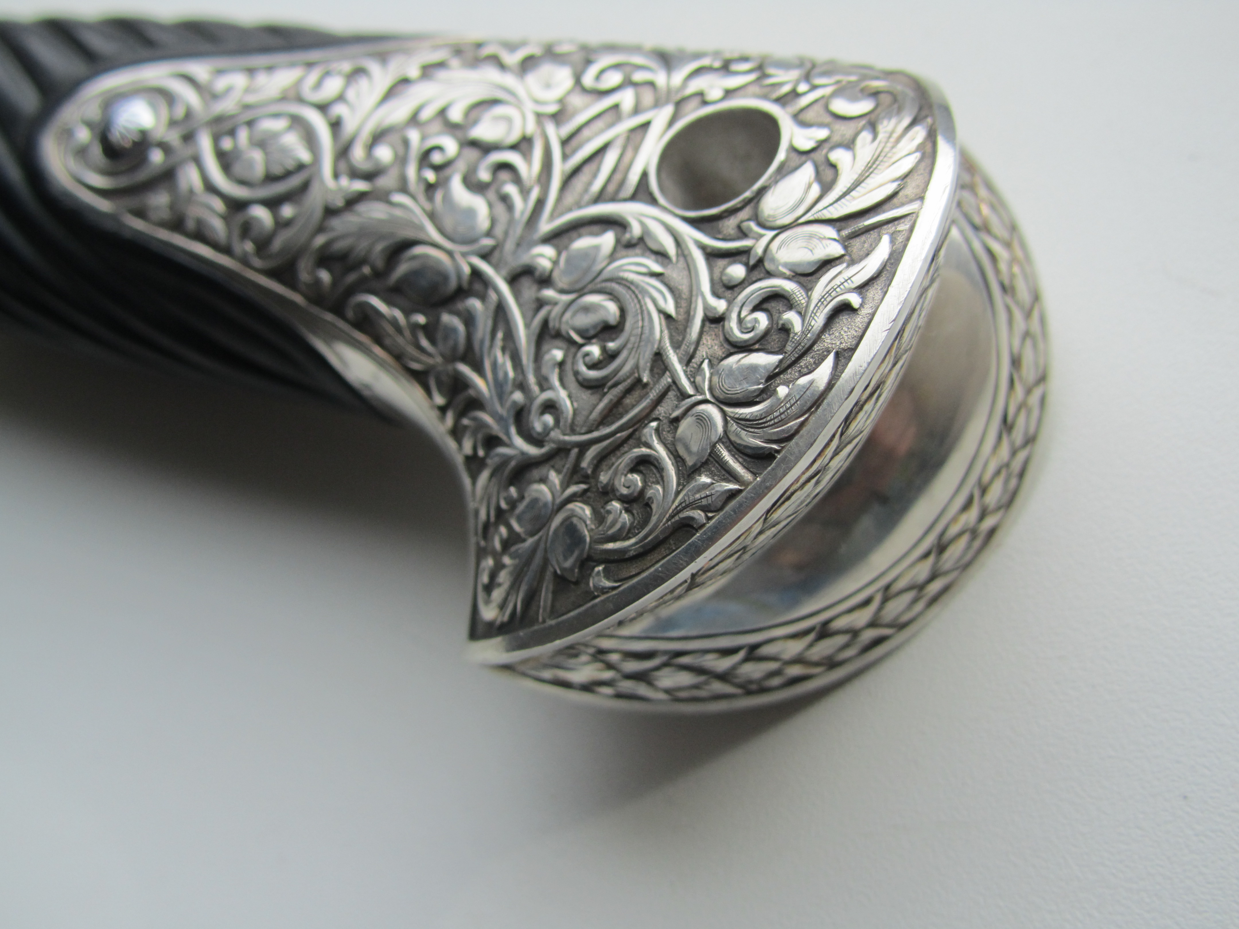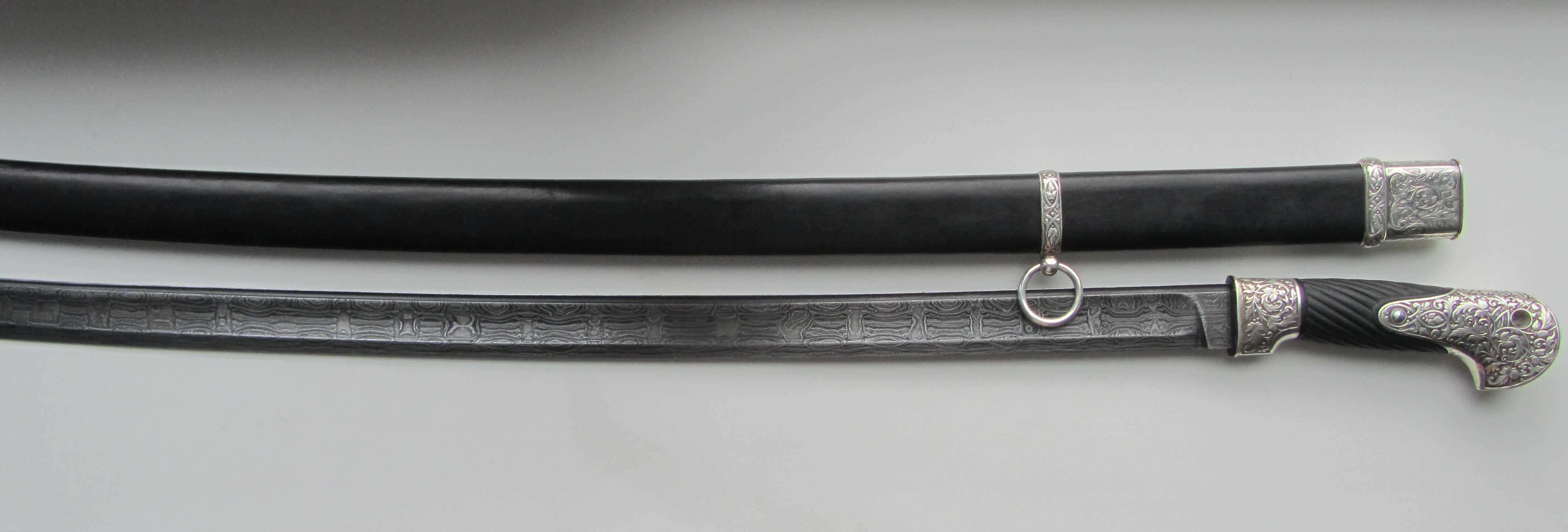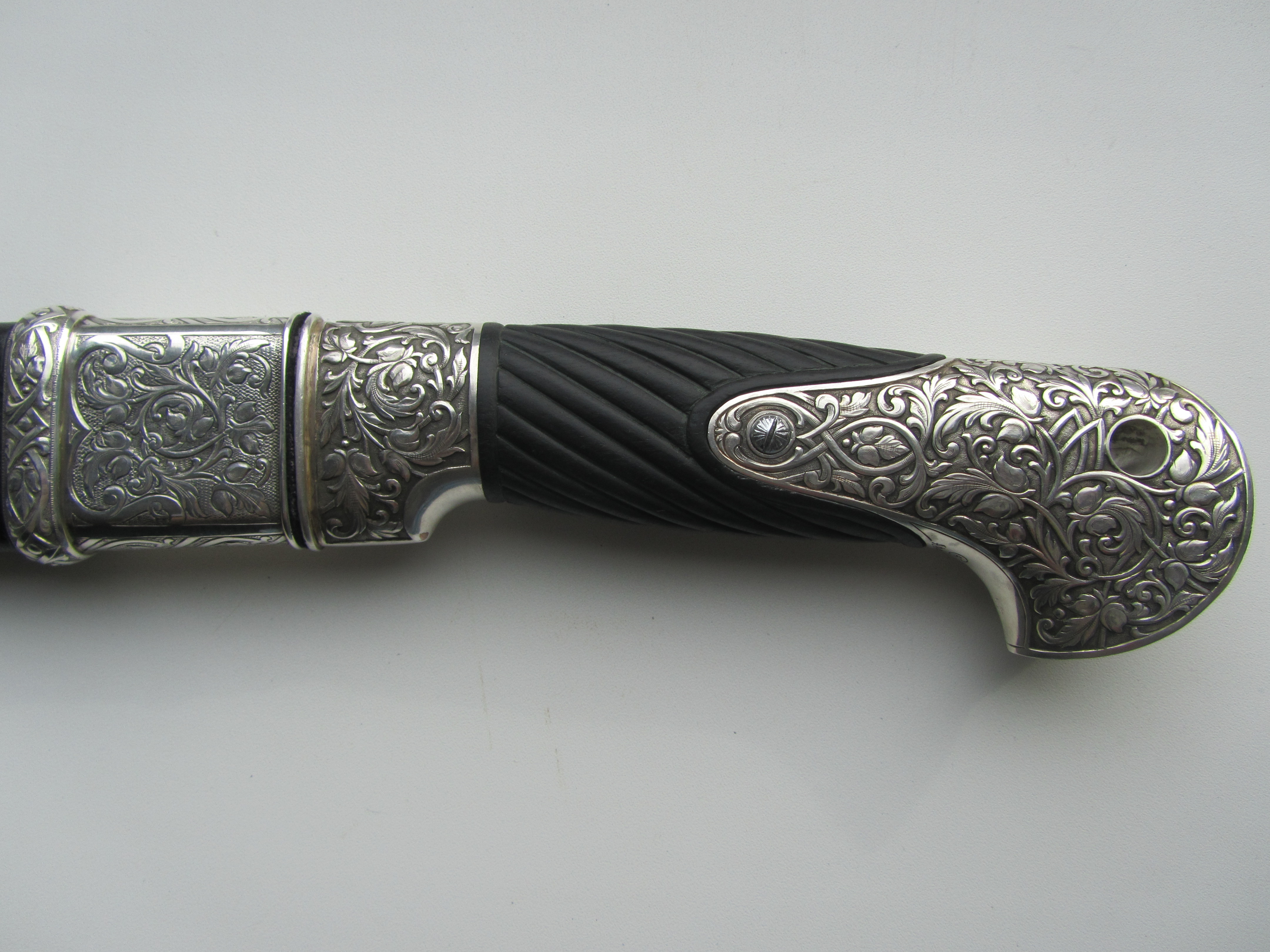 Материалы: дамаск, белый металл, эбен (черное дерево), кожа.