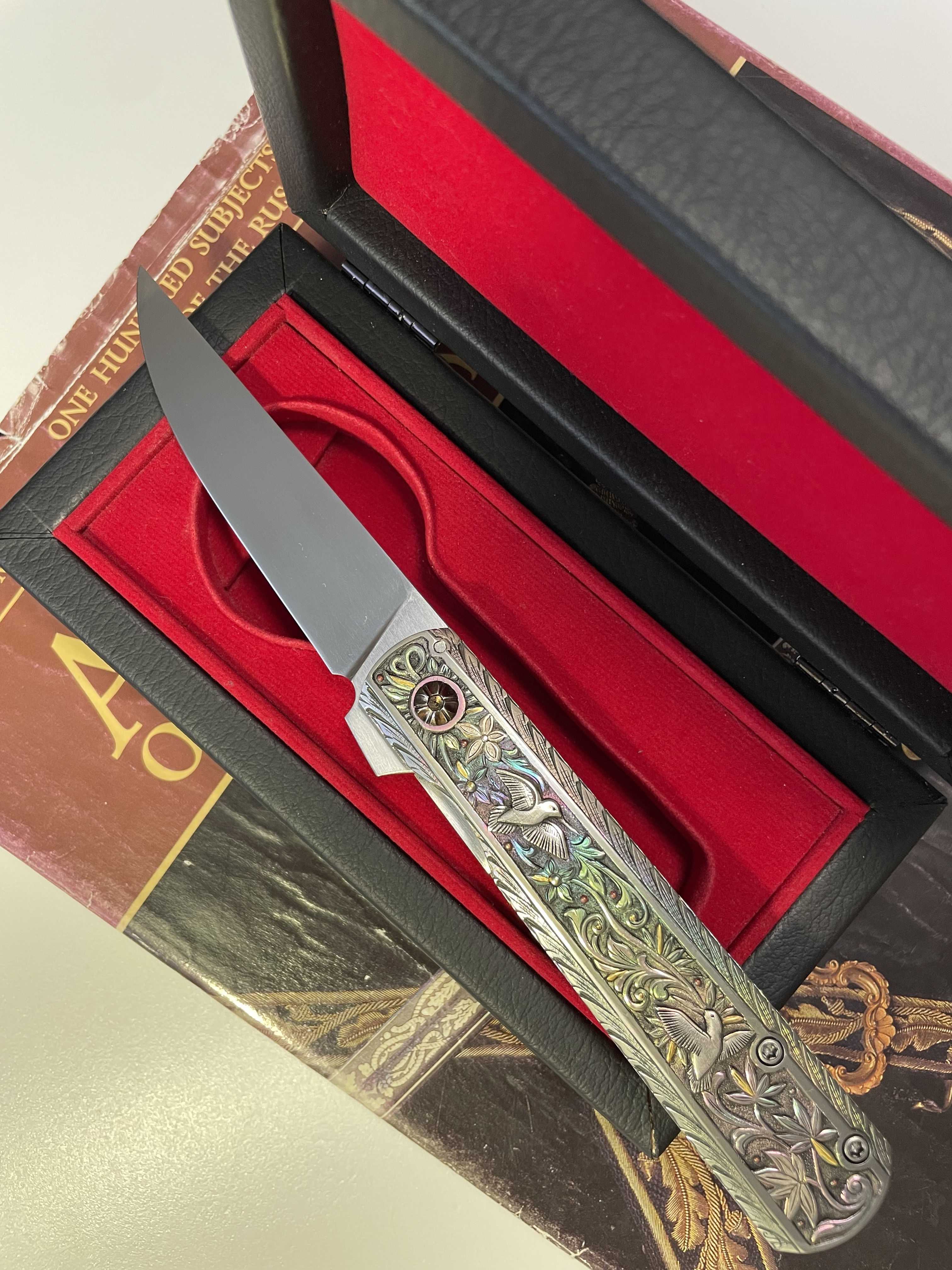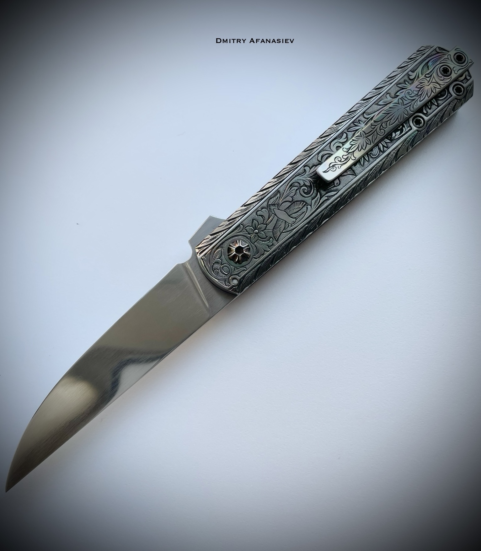 с клинком из MagnaCut , рукоять титан и ручной гравировкой.