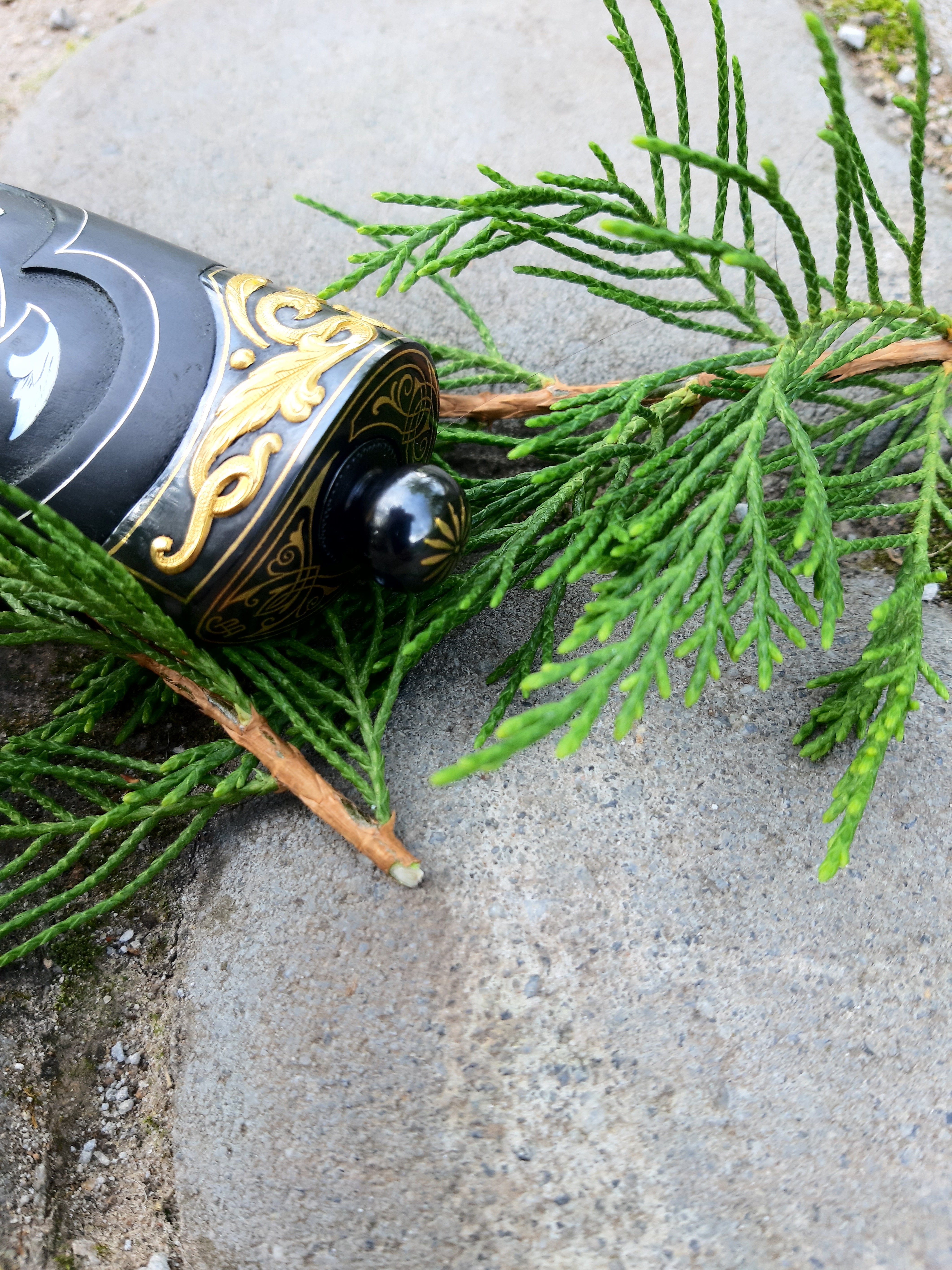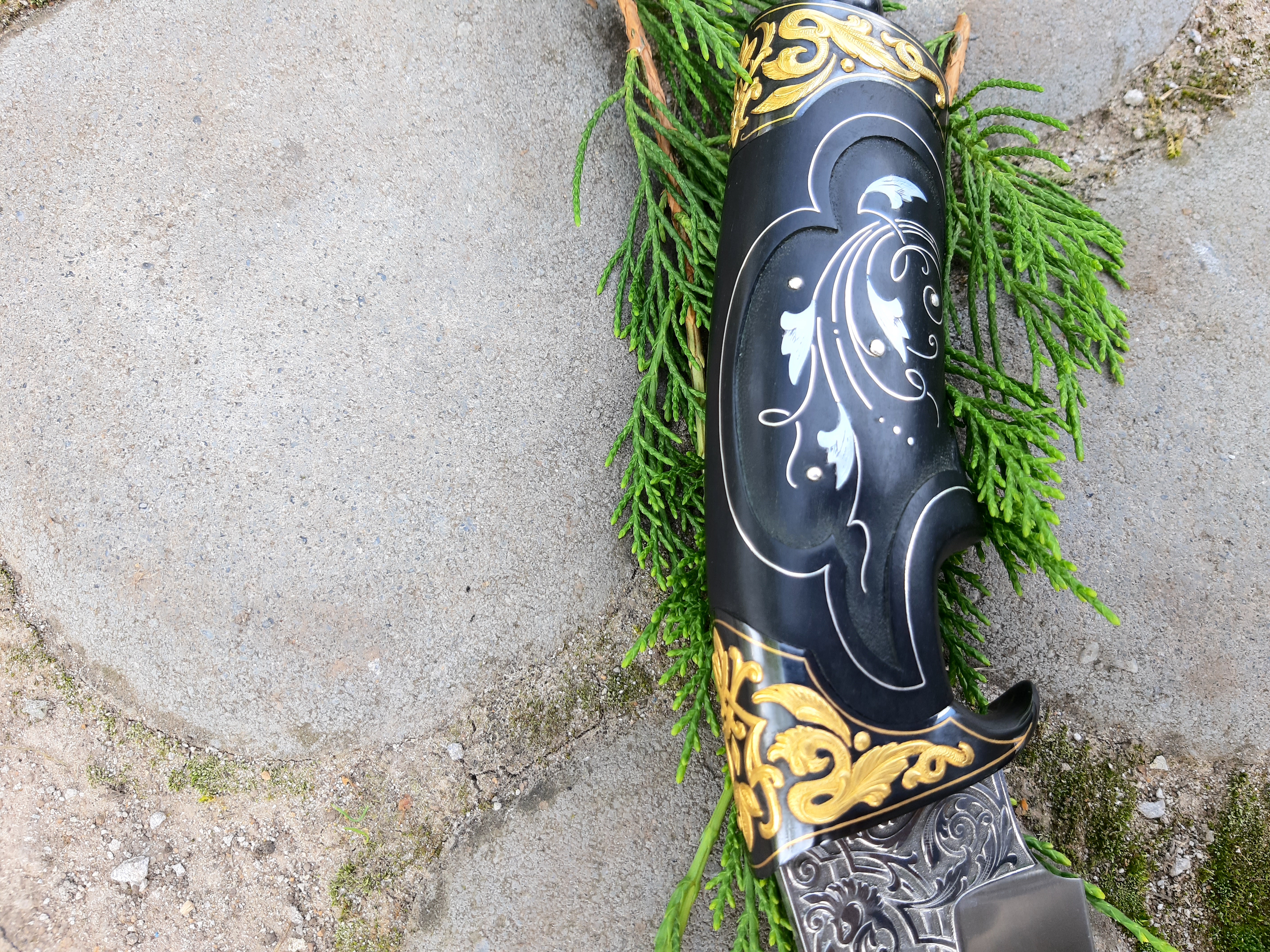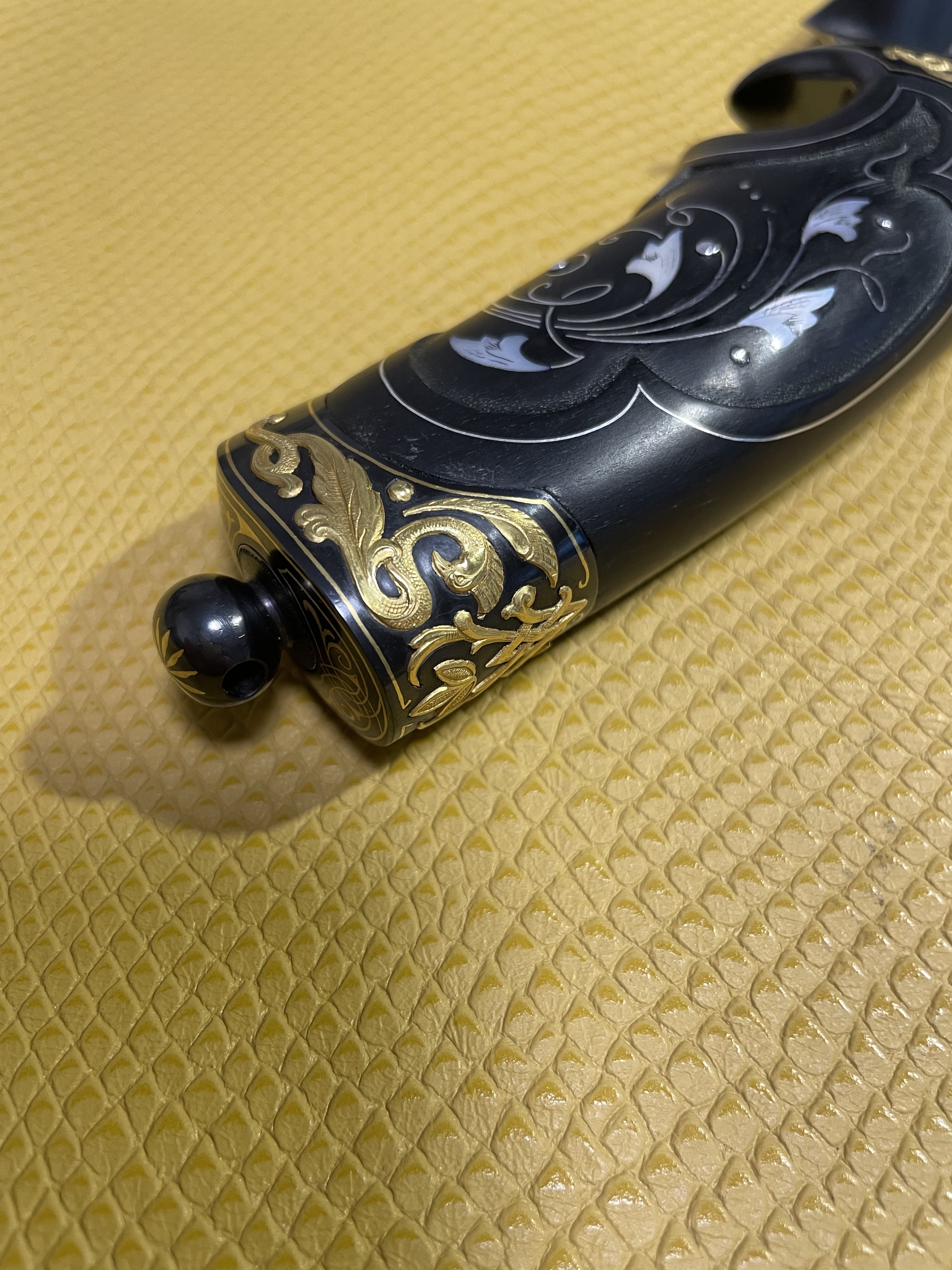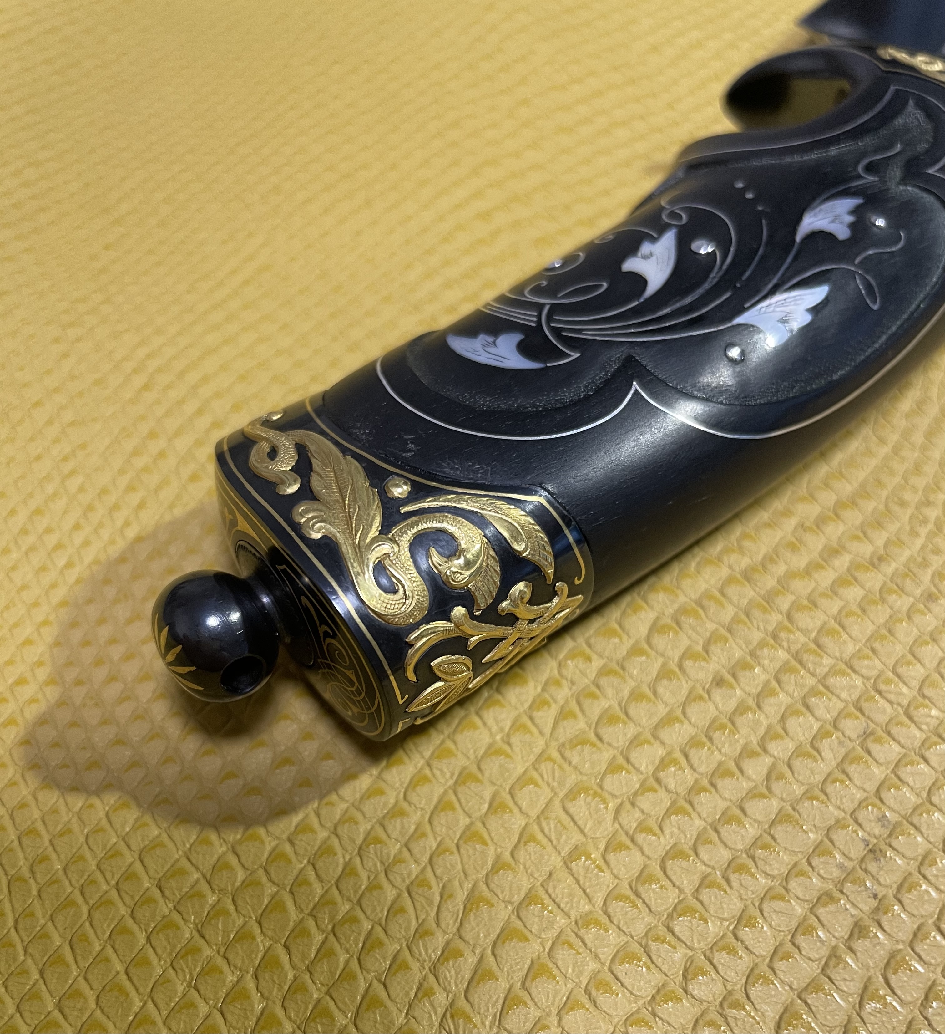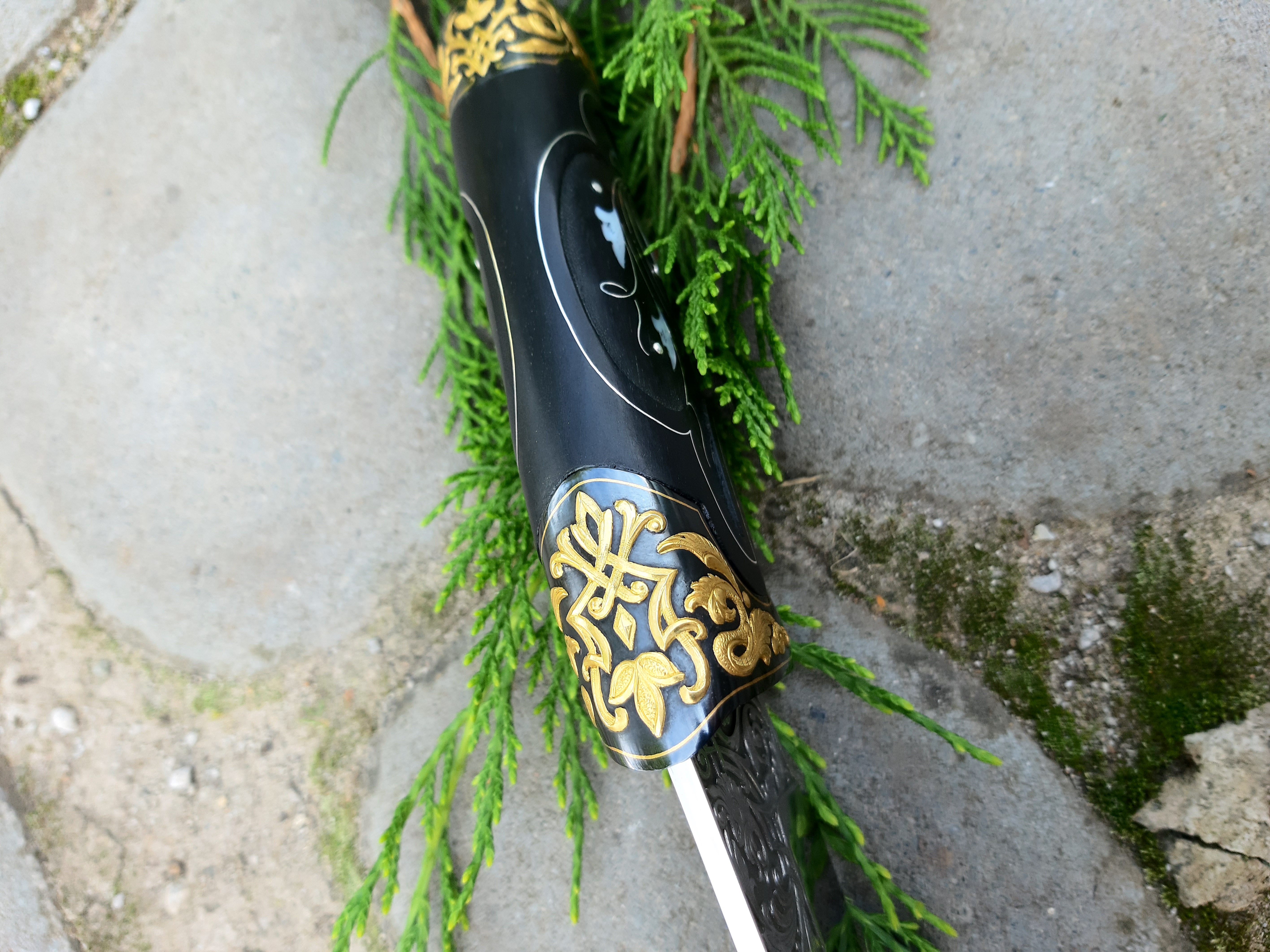 -Рукоять: орех,инкрустация желтым металлом, янтарь, лак.