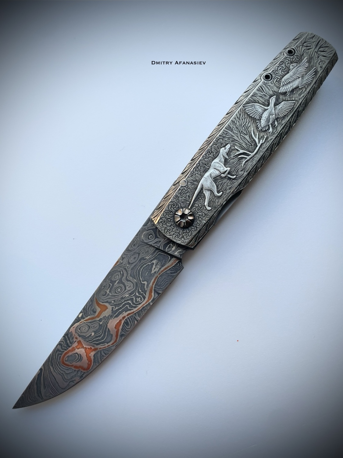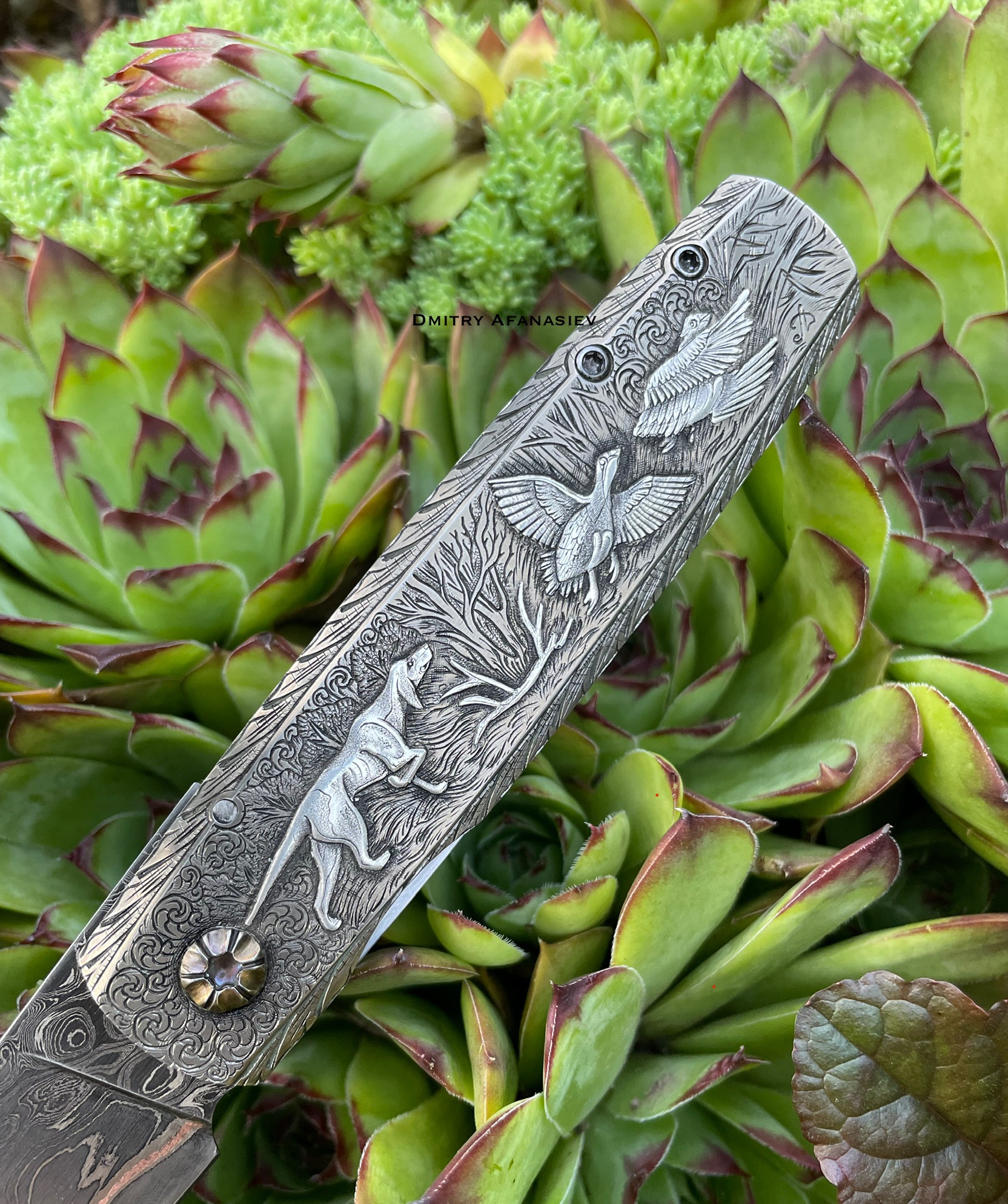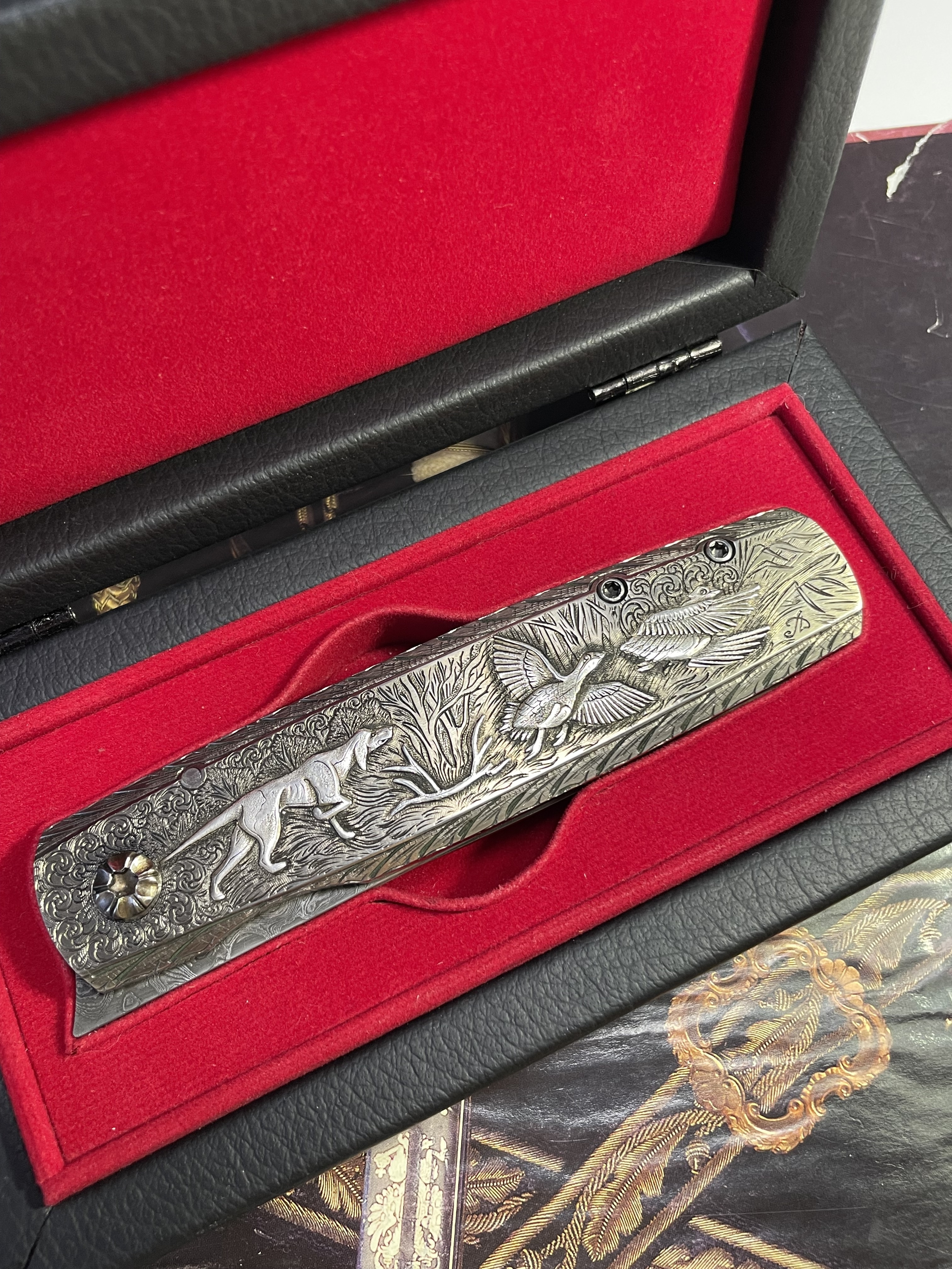 На лицевой части ножа выполнена сценка охоты на куропатку.