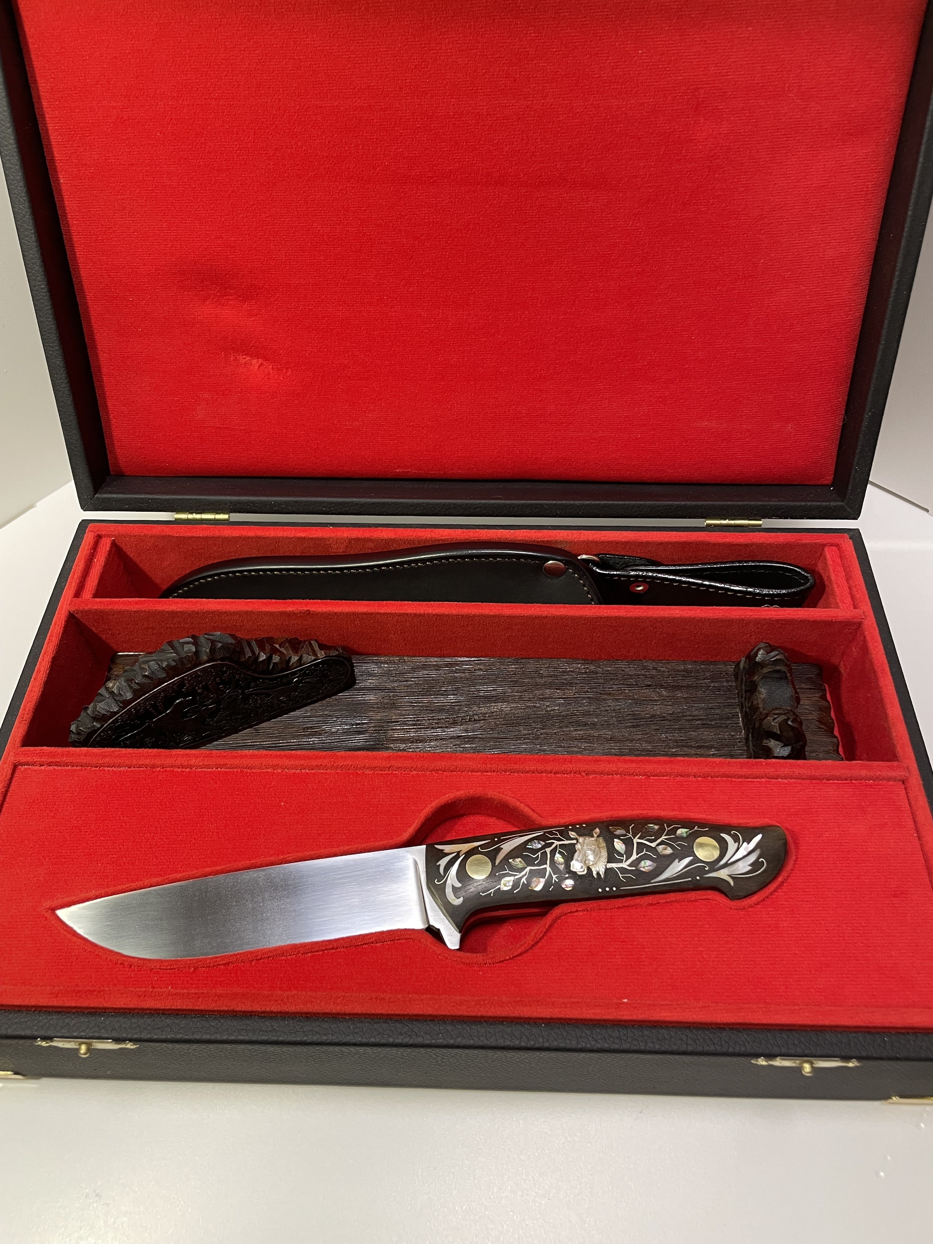 Орех, перламутр,белый метал, инкрустация.