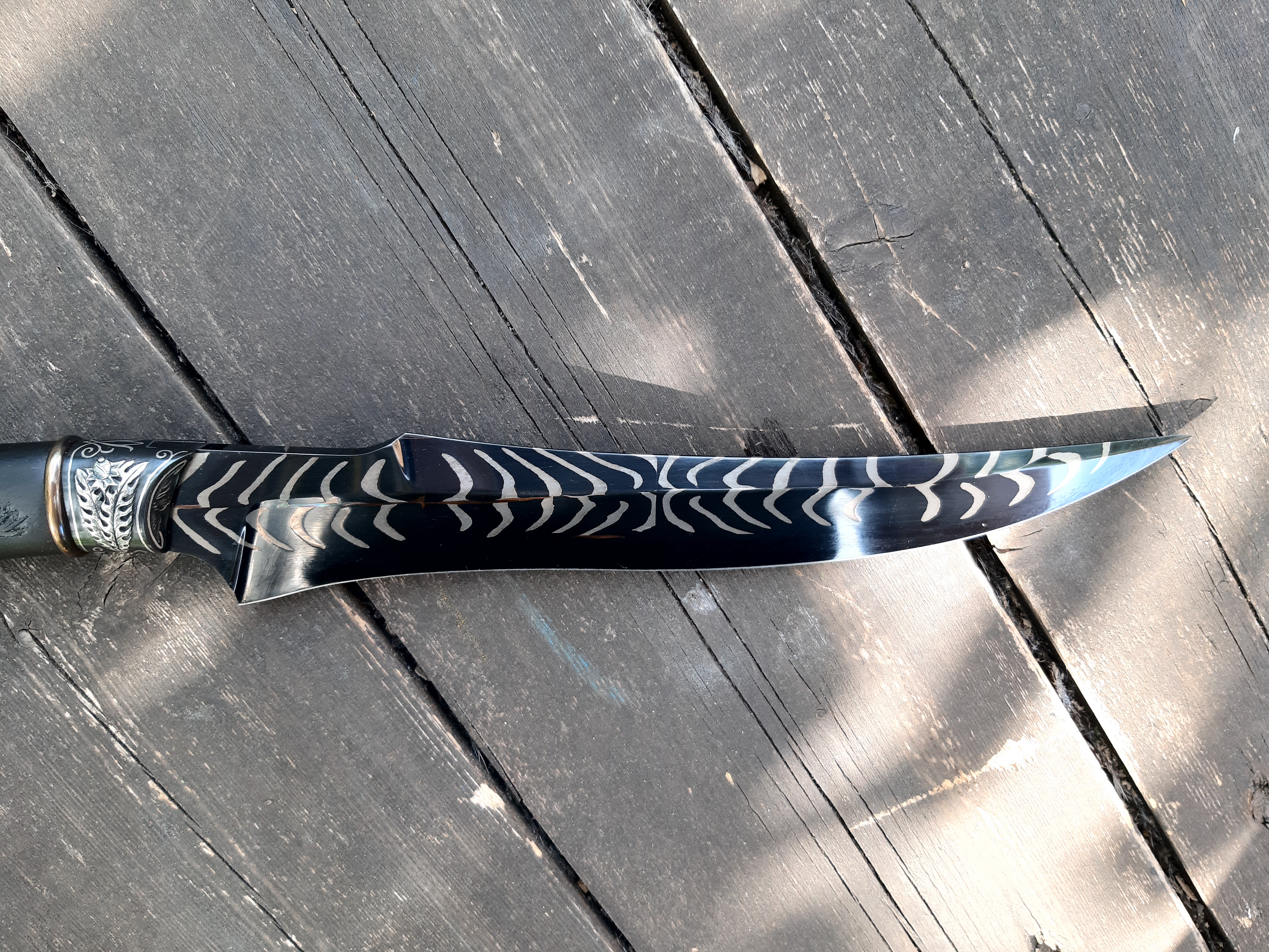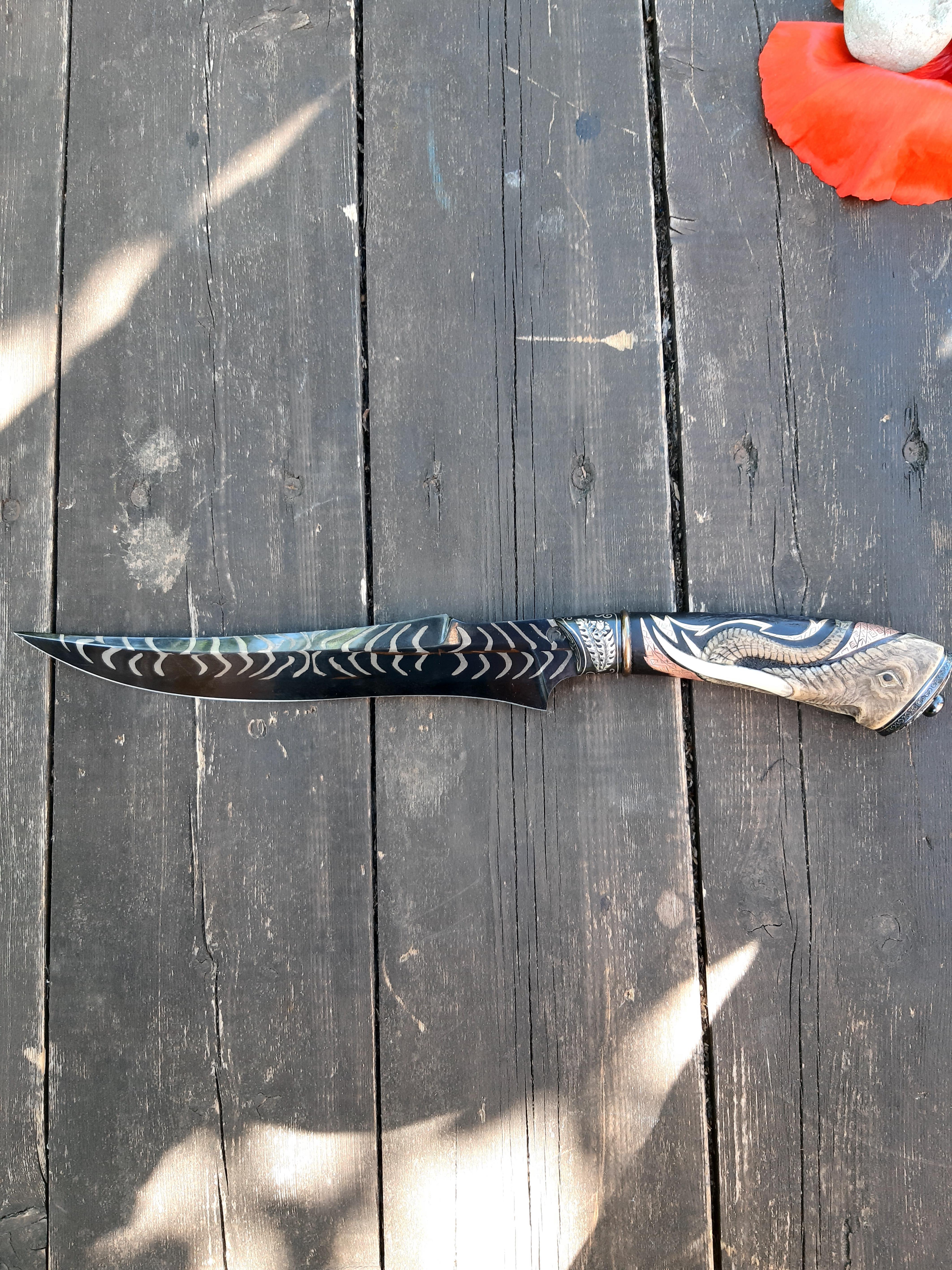 Клинок мозаичный дамаск с добавлением никеля твёрдость 60-62 единицы.
