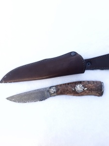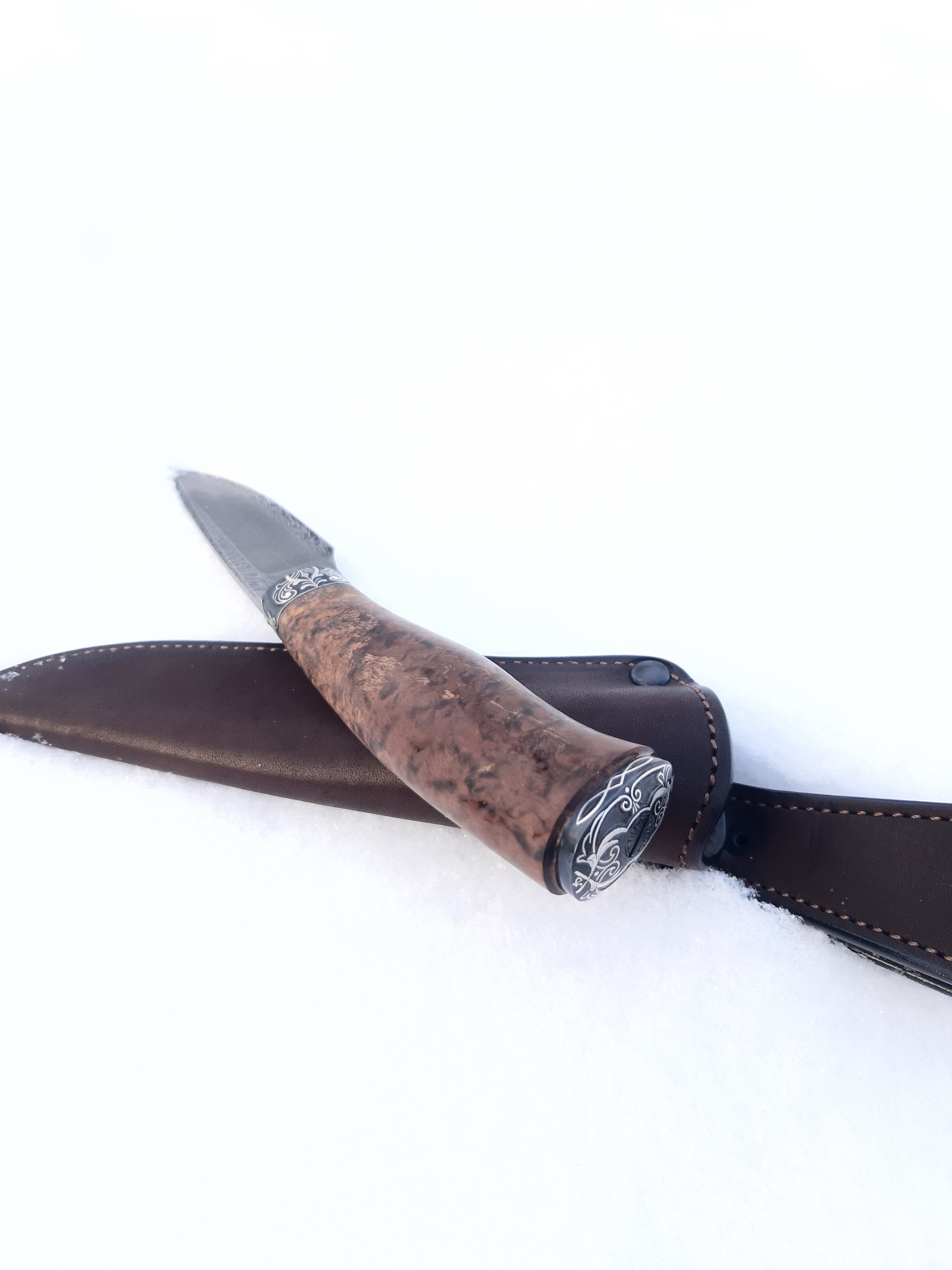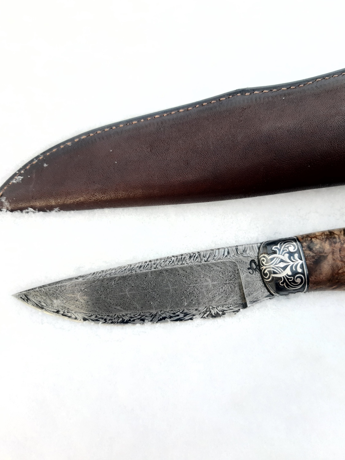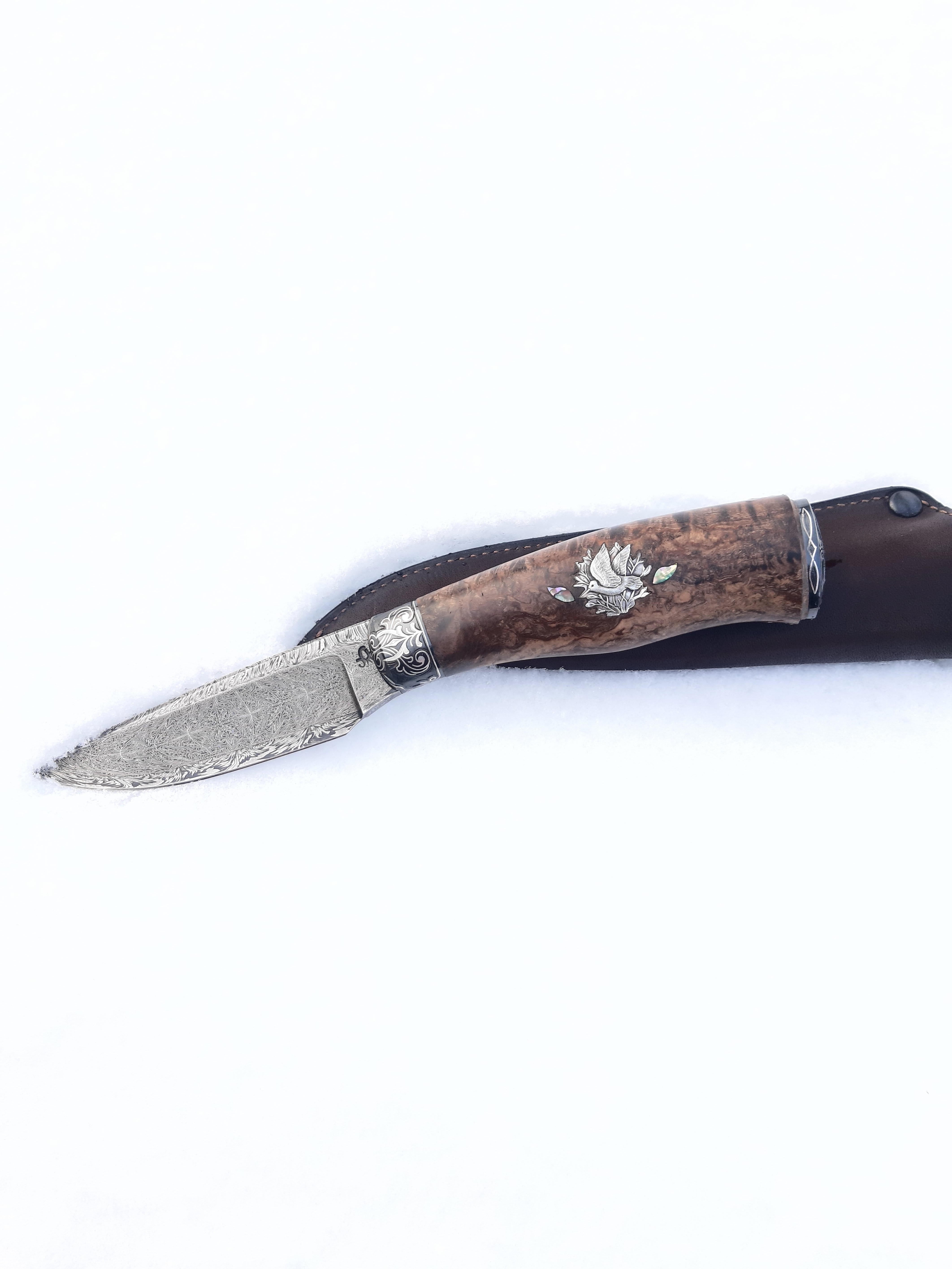 Клинок дамаск, гравировка, перламутр, дерево карельская берёза.