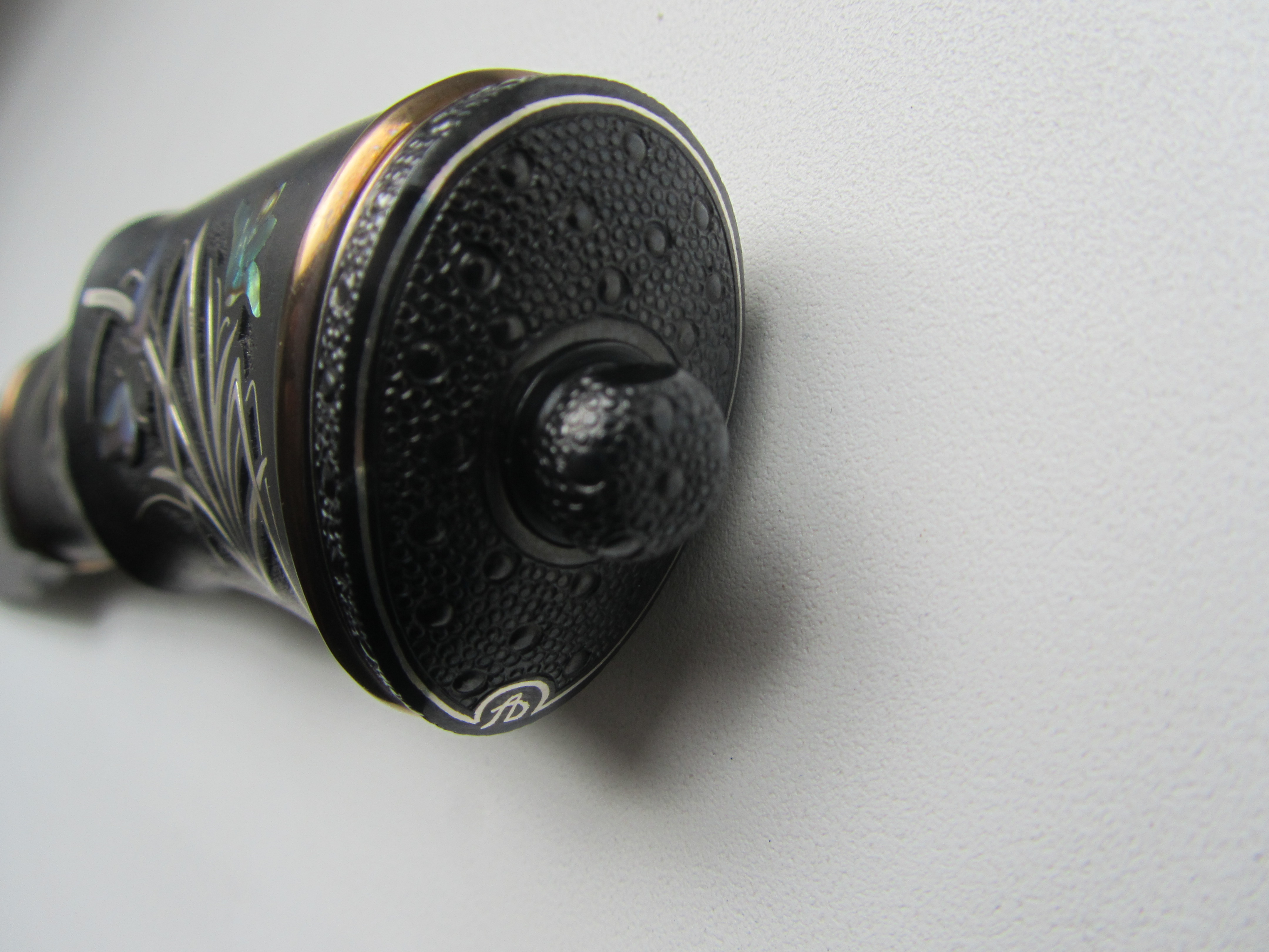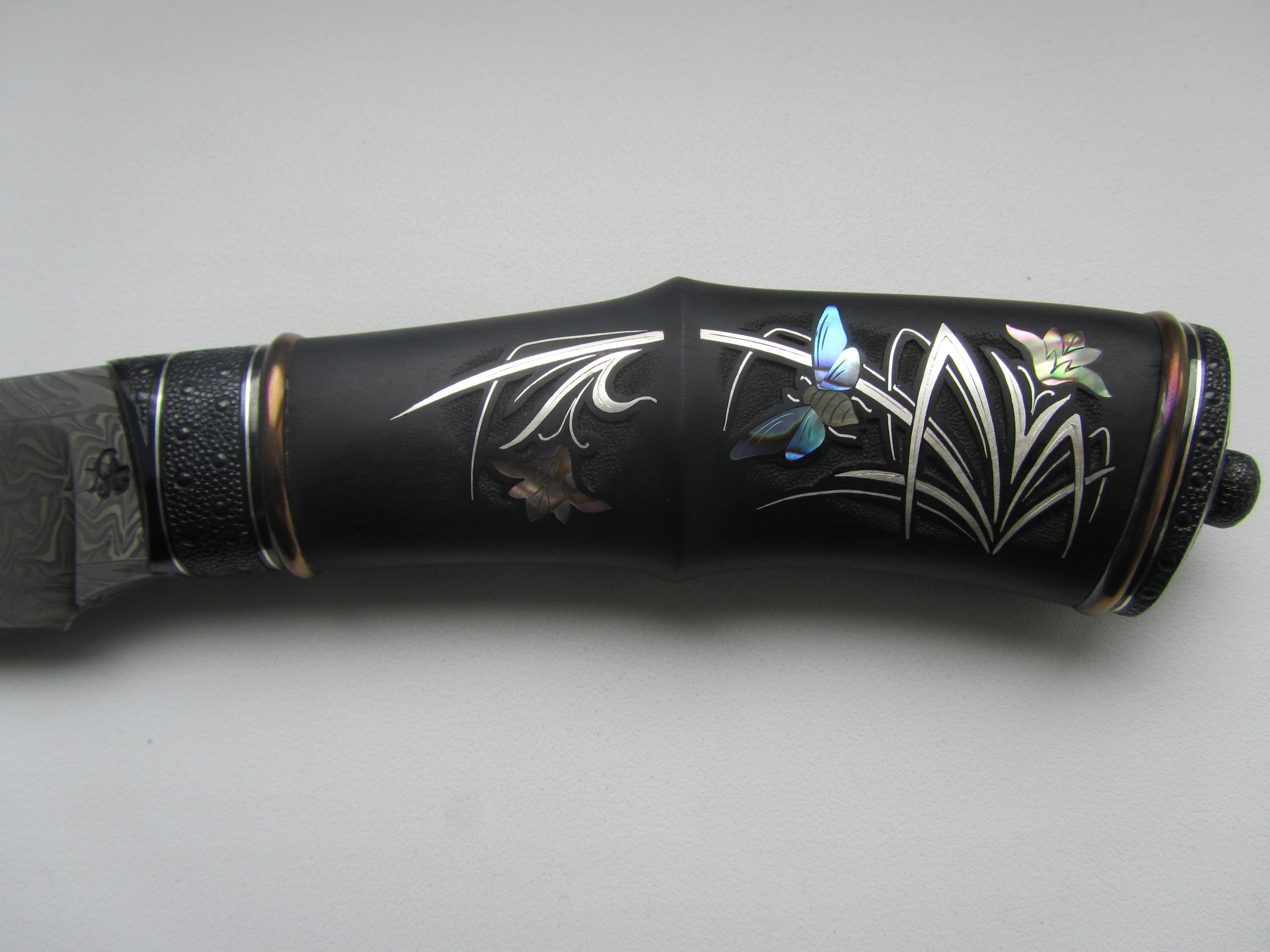 Рукоять,чёрное дерево,всечка белым металом,резьба по дереву,перламутр.