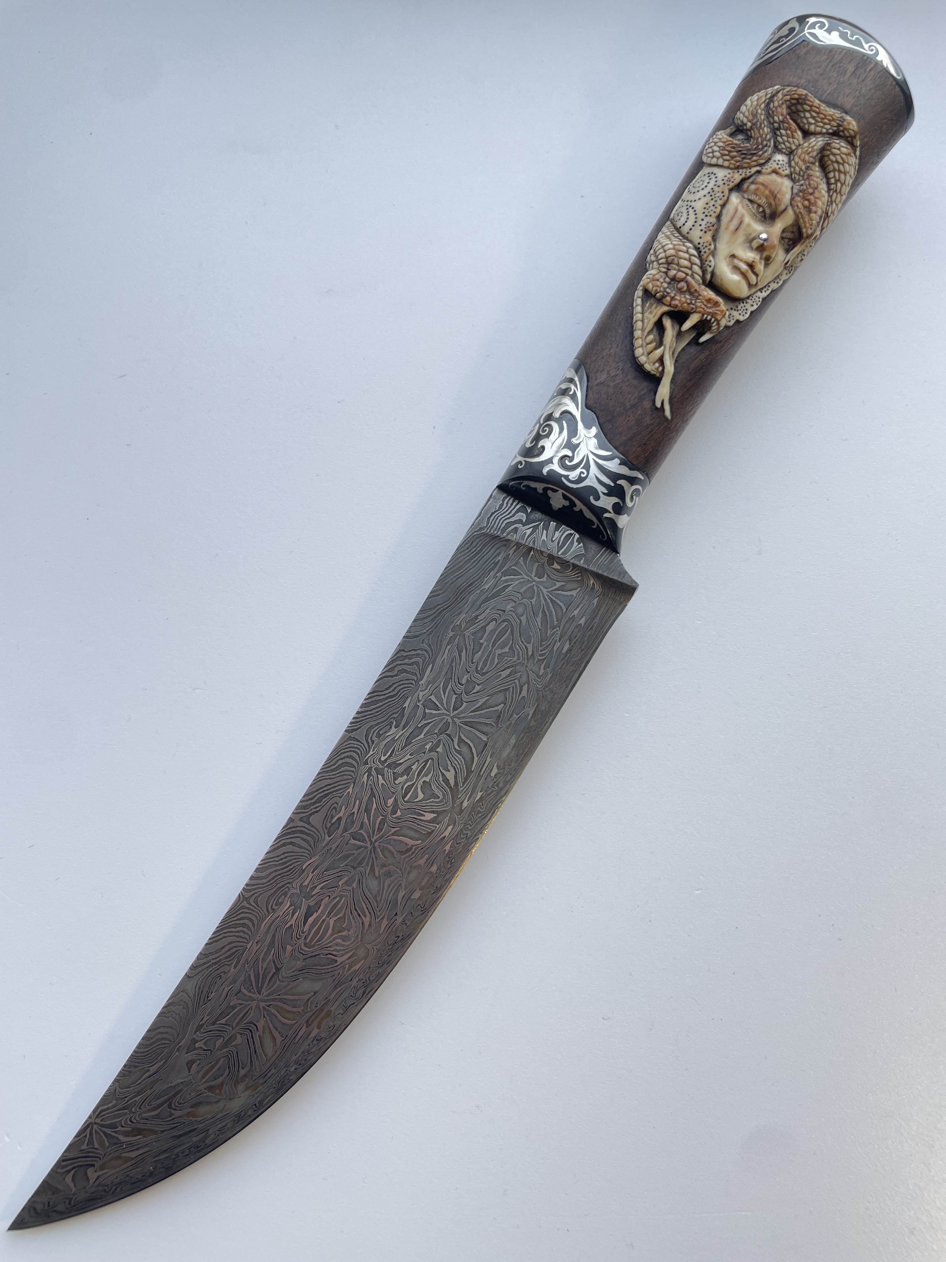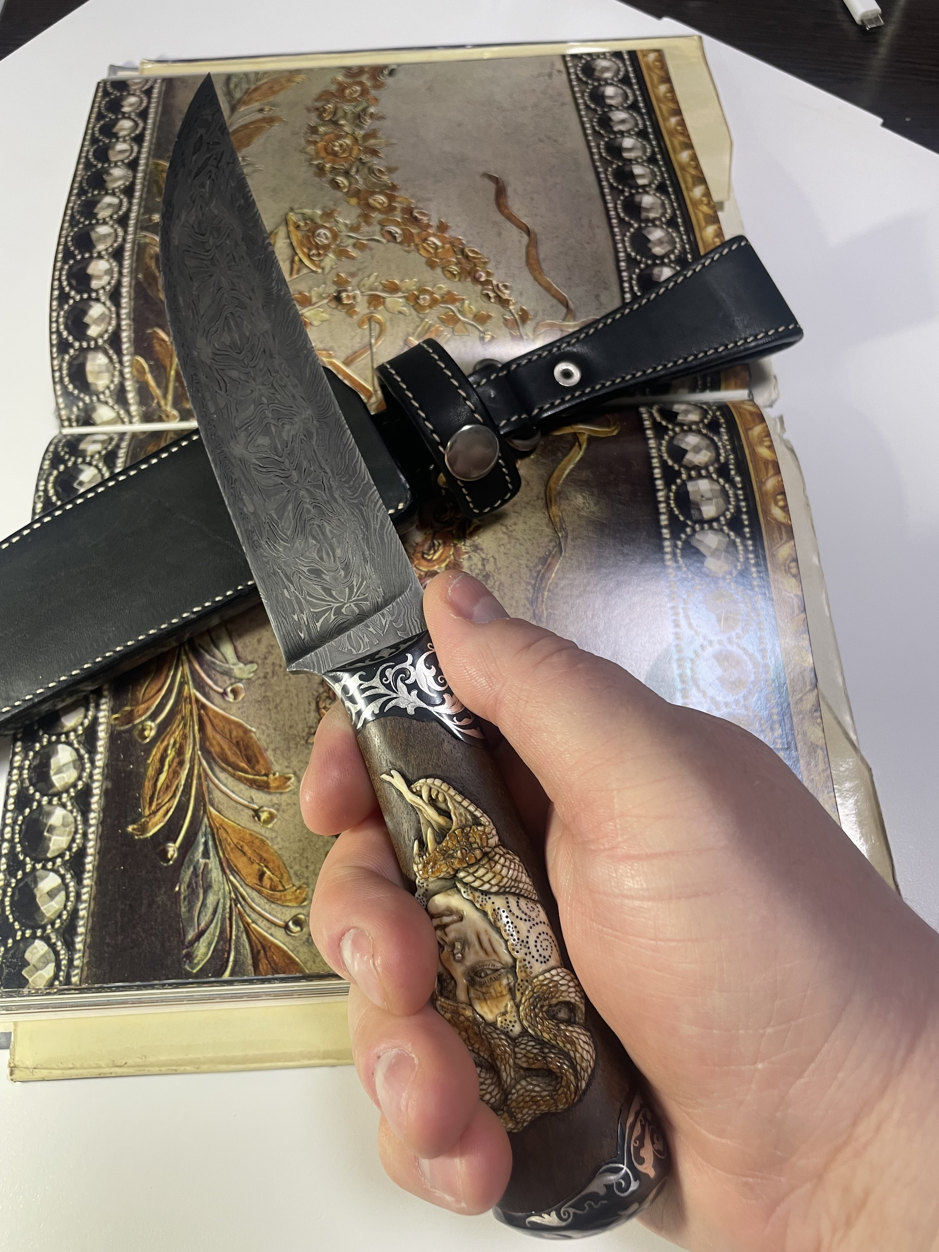 Клинок ковал кузнец Матвеев, мозаичный дамаск с добавлением никеля ,твёрдость 62 единицы.